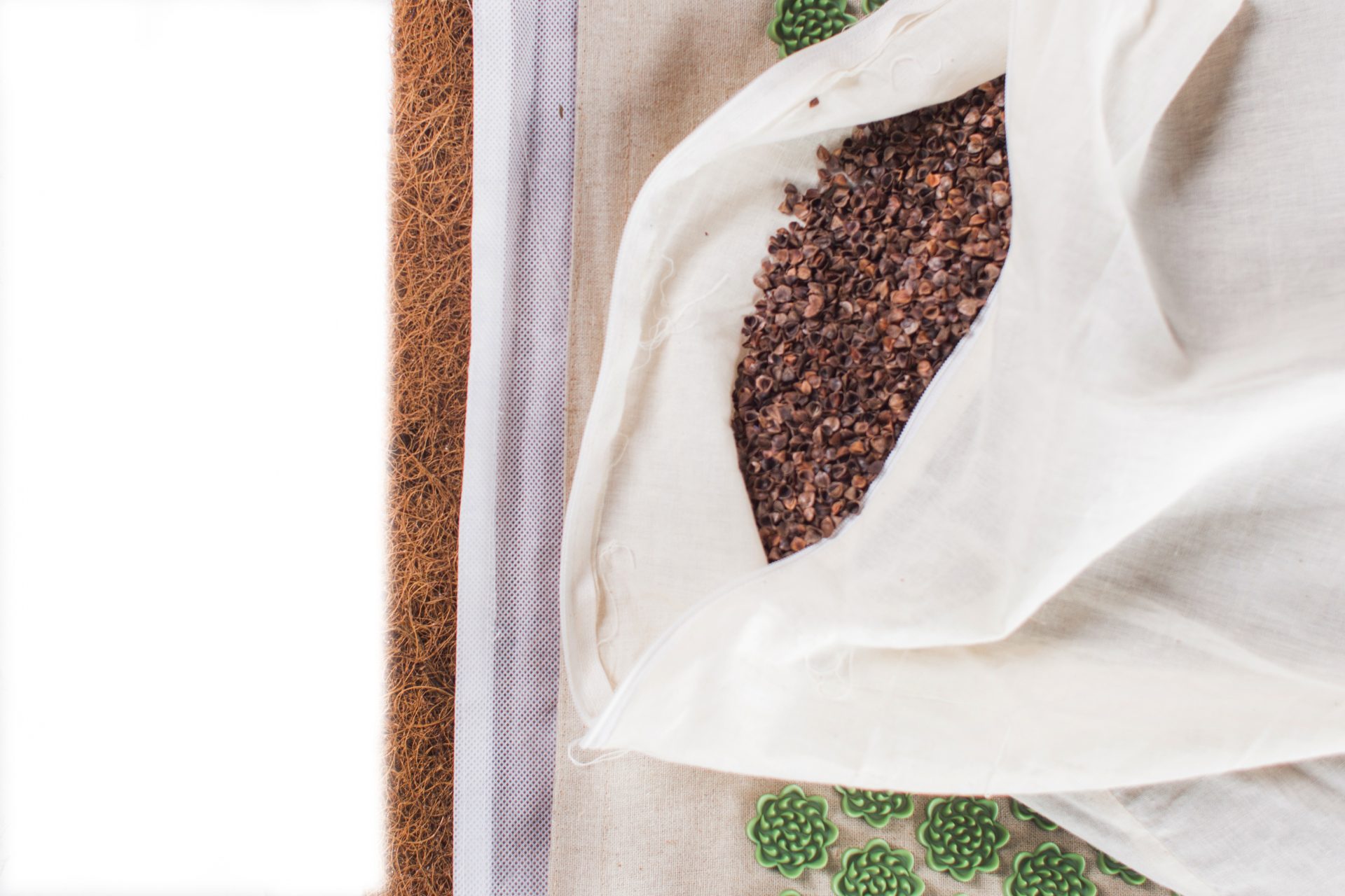 - Białe, bawełniane wewnętrzne pokrowce możesz wyprać ręcznie lub w pralce w programie dla prania bawełny- max 40°C, wcześniej usuwając odpowiednio z wewnętrznego pokrowca maty- materac z włókna kokosowego, a z wewnętrznego pokrowca poduszki- wypełnienie z łusek gryki.